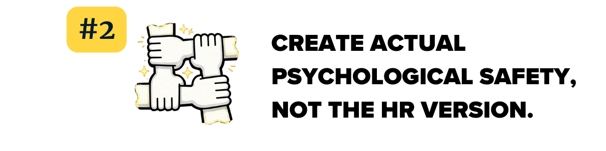 Real psychological safety means people can say "I think this strategy is wrong" in a meeting without career consequences. It means someone can surface a problem with a leader's pet project without getting frozen out of decisions. It means a failed experiment gets a retrospective, not a witch hunt.